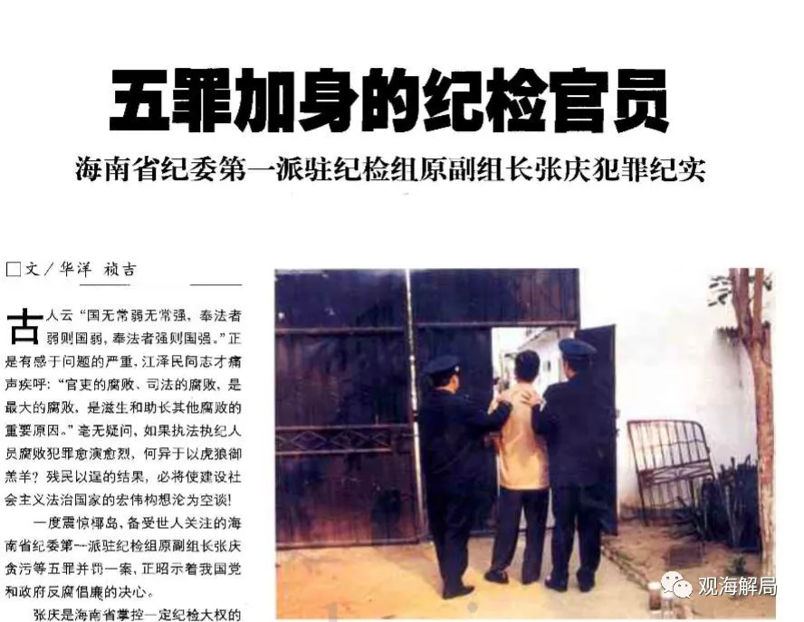 于张庆的案情,在其获刑后海南省检察院曾发文称:一度震惊椰岛, 倍受世人关注的海南省纪委第一派驻纪检组原副组长张庆贪污等五罪并罚一案,颇具传奇色彩。张庆被一审法院判处刑期之高, 罪名之多, 贪财数额之大, 在全国纪检部门尚属首例。